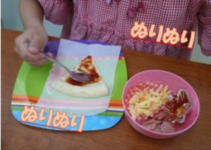 自分の分のピザ生地に、ケチャップやコーン、ウインナー、チーズなどを