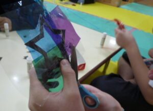 カラーセロファンや黒い画用紙を使って、好きな形を切り抜いたり、