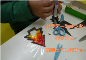 「使うのは3色セロハンだけど、ぼくのは4色なんだ。ほら、重ねてるから!」と、