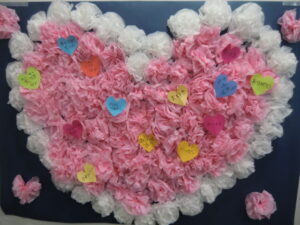 あたたかい言葉を書いて、お花紙で作ったハートの壁面アートに貼ってもらいました!
