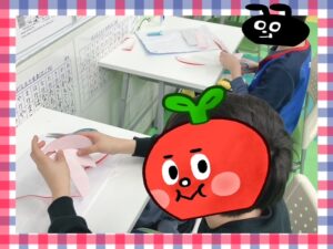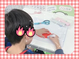 ハサミを使って折り紙をチューリップの形に切ります。みんな全集中!!